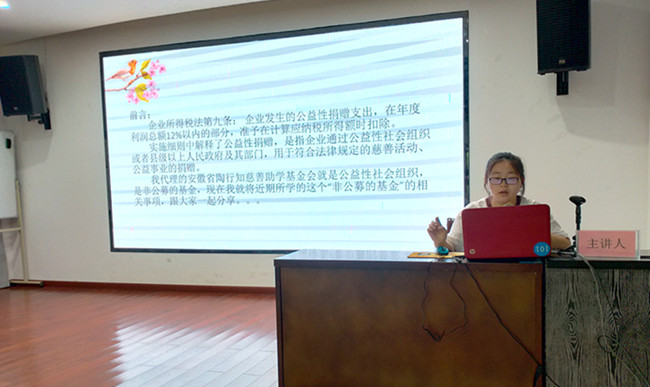 方智敏是一名初級會計(jì)師,她工作認(rèn)真,勤奮好學(xué),善于思考,她結(jié)合自己平時工作中總結(jié)出的工作經(jīng)驗(yàn),從非公募基金會支出費(fèi)用的規(guī)定、公益性捐贈稅前扣除資格審核、民非會計(jì)制度賬套的建立等等幾個方面進(jìn)行詳細(xì)介紹。經(jīng)過方智敏的講解,使參與人員對公益性稅前扣除條件和要求有了更深入的了解和認(rèn)知,對民非賬套制度建立的操作過程更加清晰明了。